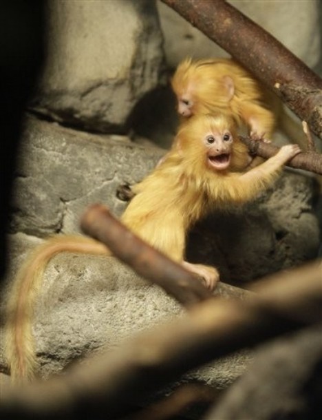 A baby golden lion tamarin rests on an adult tamarin at the Cleveland Metroparks Zoo Friday, Feb. 4, 2011, in Cleveland. Two baby tamarins were born on Dec. 27, 2010 at the zoo. Golden lion tamarins are orange-colored monkeys. The large amount of hair around the face resembles a lion's mane and accounts for this subspecies' name.