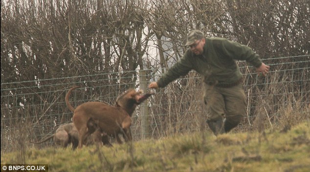 A wildlife photographer Robert Fuller managed to take this picture showing one of the men snatching at a badger in the dog's mouthFour thugs who were caught laughing as their dogs tore wild animals to pieces have been jailed for their part in ‘barbaric’ and ‘abhorrent’ badger baiting.